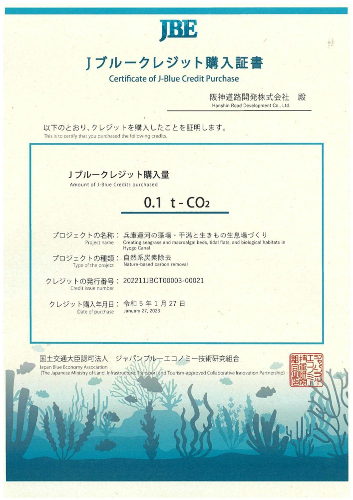 当社はこの度、神戸港の兵庫運河における藻場や干潟の保全活動により創出されたブルーカーボンについて、ジャパンブルーエコノミー(JBE)技術研究組合(国土交通省認可)により認証された、Jブルークレジットを購入いたしました。